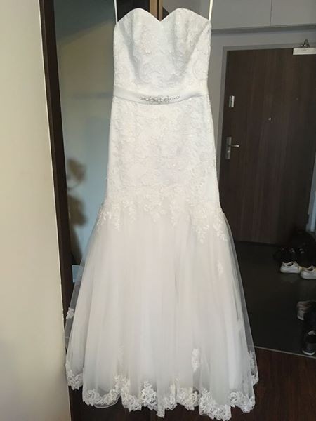 Suknia założona dwa razy - w dniu ślubu i na połoninie Caryńskiej na sesji plenerowej w Bieszczadach. Tren 2,5 metra z koronkowymi elementami. Bolerko koronkowe stan idealny. Suknia po lekkich poprawkach krawieckich. Welon gładki bez dodatkowych elementów. Sprzedaje cały zestaw z kołem. Możliwość regulacji. Dol sukni wykończony koronka. Suknia pięknie rozkłada się podczas obrotów w tańcu. Na wzrost ok. 170 + obcas. Dodatkowo oddam zainteresowanym sukienkę do zdjęć plenerowych.
