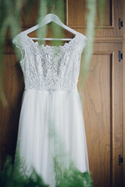 Suknia ma kolor śmietankowy oraz piękne koronkowe wykończenie z delikatnym błyskiem na górnej części - dzięki przyszytym licznym koralikom i cekinom.