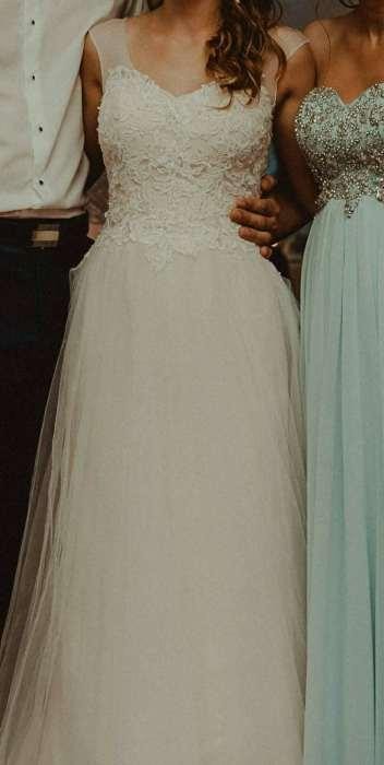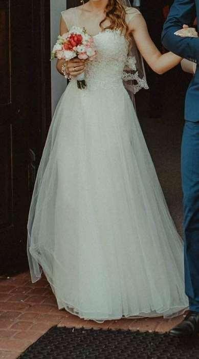 Witam, sprzedam suknię ślubną w rozmiarze 34, jest to model Enchanting by Mon Cherie. Kolor Ivory/Nude, dół 3-warstwowy (na wierzchu tiul), z podpinanym trenem. Suknia jest na wzrost 160 cm +10 cm obcas. Szerokość w pasie 66 cm, długość gorsetu 23 cm.