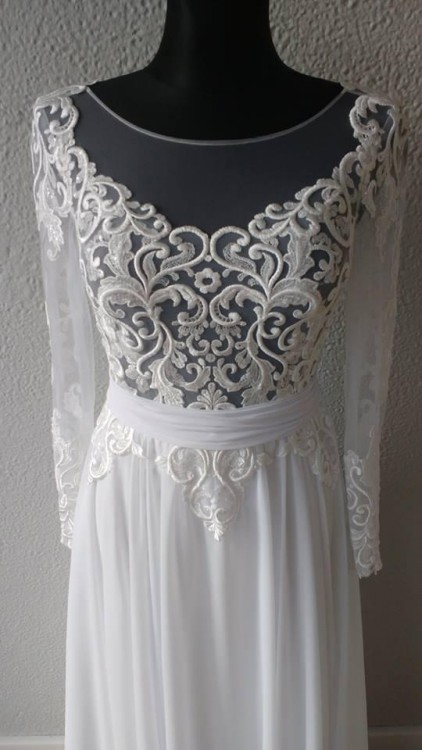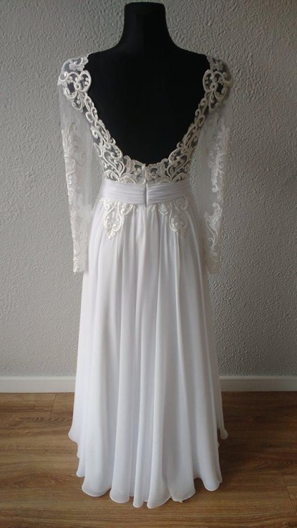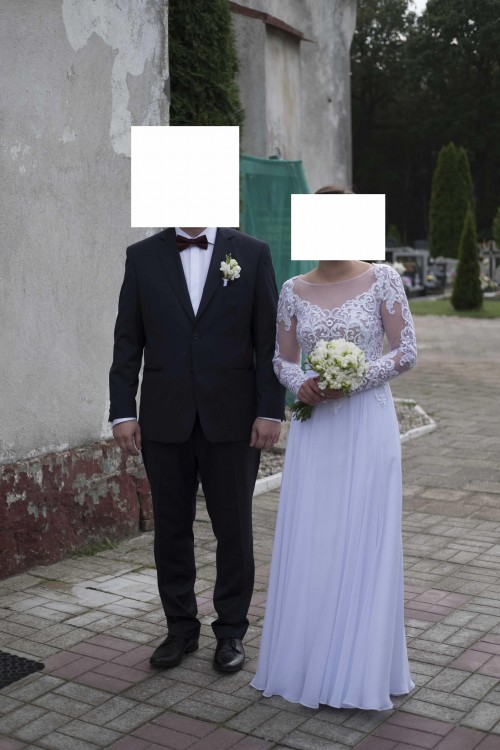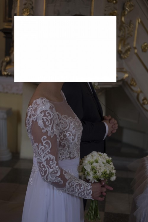 Sprzedam suknię ślubną, uszytą na miarę. Suknia jest bardzo delikatna, kobieca i zwiewna. Rozmiar 36, wzrost 160 cm + 9 cm obcas. Góra sukni wykonana jest z gipiury, umieszczonej na rozciągliwej, wygodnej siateczce. Suknia posiada długie rękawy. Tył sukni w kształcie litery V, wycięcie do wysokości biustonosza.Suknia zapinana na kryty zamek. Suknia posiada dodatkowe zaszewki, w które wsunąć można zapięcia biustonosza, co uniemożliwia jego wysuwanie. Dół sukni wykonany z lekkiego zwiewnego muślinu. Suknia posiada pasek dodatkowo podkreślający talię.