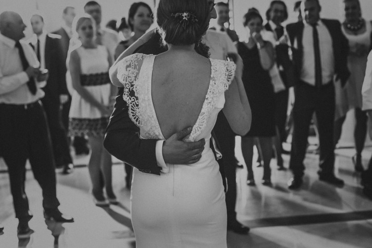 Kształt sukni wysmukla i podkreśla figurę, a odkryte plecy dodają zmysłowości.