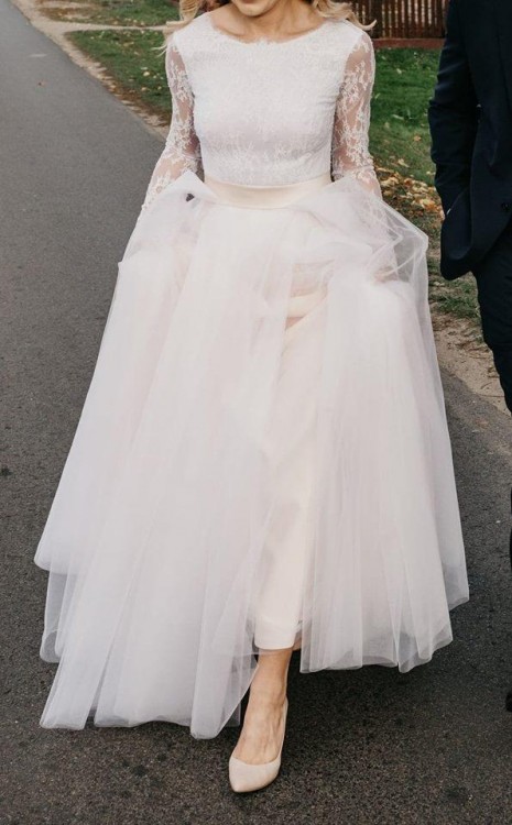 Mam do sprzedania piękną suknię ślubną rozmiar 36/38. Suknia była szyta na miarę, wzrost 170cm + 9cm obcas. Kolor śmietankowy , dół na brzoskwiniowym podbiciu. Góra to delikatna koronka z dekoltem w lekka łódkę z przodu oraz mocno odkrytymi plecami. Przód na podszewce dzięki czemu nie widać stanika. Dół wykonany jest z kilku warstw francuskiego tiulu osadzonego na brzoskwiniowej podszewce co daje piękny ciepły odcień.