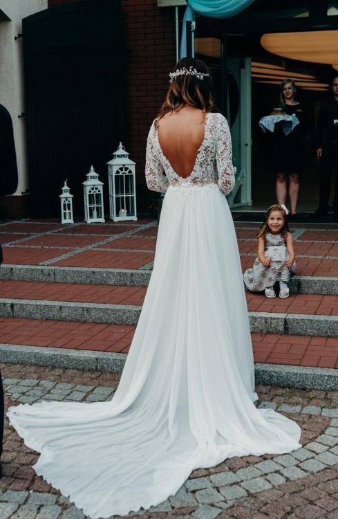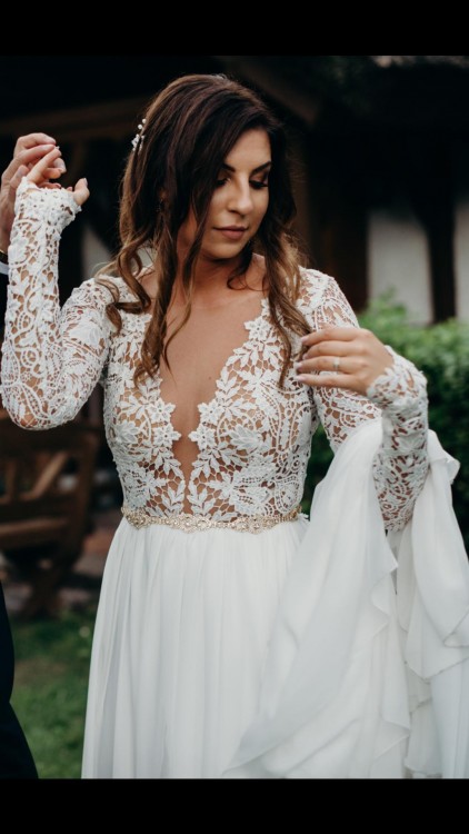 Suknia ma wszyte miseczki rozmiar B. Suknie miałam na sobie tylko w dniu ślubu. Koronka bawełniana więc więc bardzo przewiewna. Dół uszyty z kilku warstw muslinu pieknie uklada się w tańcu.posiada rozporek.
