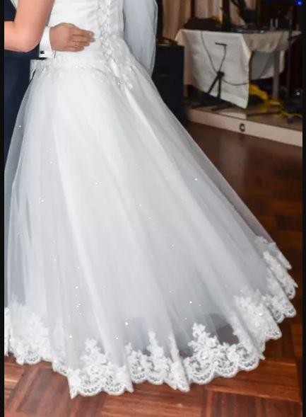 Mam do sprzedania suknie ślubną( długi welon i bolerko z długim rękawem w cenie). Suknia szyta jest na rozmiar 40/44, wzrost 170 plus około 5cm obcas, Gorset jest bardzo wygodny(możliwość usunięcia ramiączek), usztywniony. możliwość regulacji , halka z małym kołem.. Suknia jest lekka i wygodna. Ubrana na ślub, wesele Wyprana w profesjonalnej pralni, w stanie idealnym czeka na nową właścicielkę. W razie pytań proszę o kontakt.