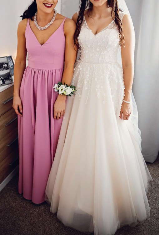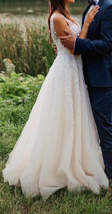 Suknia jest w kolorze ivory (śmietankowy) w lekkim odcieniem brzoskwiniowym (kilka warstw tiulu jest w tym kolorze oraz gorset). Posiada piękna koronkę z efektem 3D (kolor ivory). Góra sukni to gorset wiązany (wiązanie zamaskowane koronka z guziczkami). Dól sukni tiulowy (6 warstw) + halka z małym kołem. Rozmiar sukni 34/36, szyta na wzrost 160 + ok. 8cm obcas buta. Suknia do przymierzenia w Lublinie. Zapraszam do kontaktu 513204710 :)