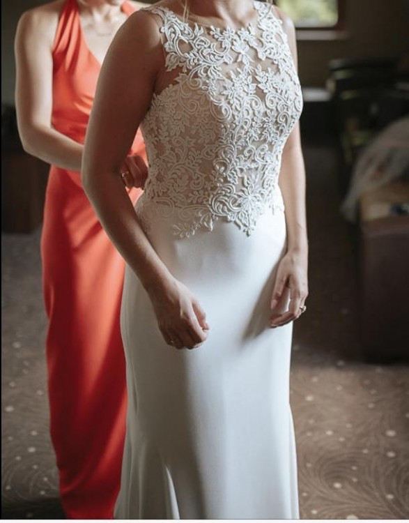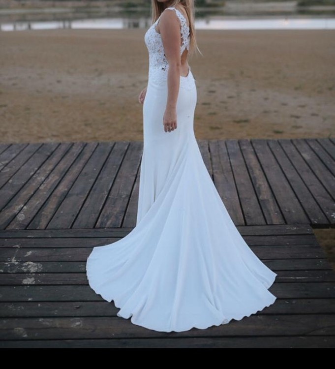 Sprzedam suknię ślubną o kształcie rybki w rozmiarze 38. Dół gładki, góra sukienki z pięknej koronki, na grubszych ramiączkach, z wbudowanymi miseczkami. Efektowny tył z mocno wyciętym dołem pleców. Boki sukienki zabudowane siateczką w kolorze cielistym. Sukienka zapinana z boku na zamek, a z tyłu na trzy guziczki. Tren można zapiąć na guziczek- taka wersja była szyta na wzrost 168 cm plus 8-10 cm szpilki.