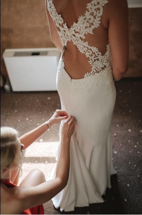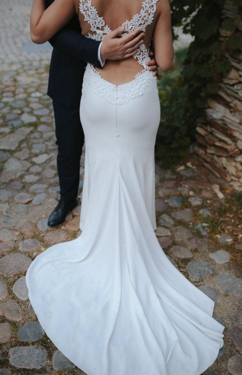 Piękna sukienka o kształcie rybki, z podpinanym trenem i efektownym tyłem. Wspaniale podkreśla kobiece kształty. Góra z koronki