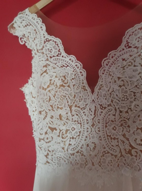 Sprzedam suknie ślubna zakupioną w salonie sukien ślubnych AVENUE 22 w Krakowie. Sukienka o kolorze śmietankowym jest uszyta na wzrost 171 cm + 6 cm obcas. W górnej części sukienki po bokach wszyte usztywnienia aby jeszcze bardziej podkreślić talie panny młodej ( bez obaw nie wpłynęło to na wygodę i komfort noszenia) Ma muślinowy dól, dzięki czemu wspaniale maskuje szerokie biodra. Jest luźna i delikatna, dzięki czemu ma charakter romantyczny i rustykalny. Miseczki mają rozmiar około D/E możliwa jest ich wymiana. Sukienka założona tylko raz. Możliwość przymiarki przed zakupem zarówno w Krakowie jak i Lubaczowie ( podkarpackie).