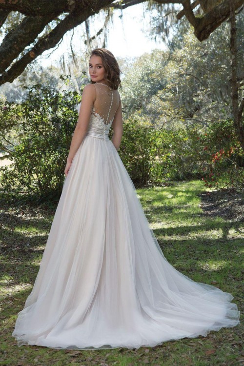Góra sukni wyszywana koronką oraz perełkami i kryształkami, przy szyi posiada wyszywany naszyjnik z kryształków, przez co nie wymaga biżuterii. W tali gruby, plisowany, atłasowy pas, który przepięknie podkreśla talię.