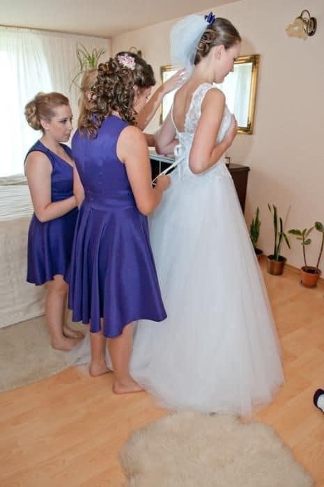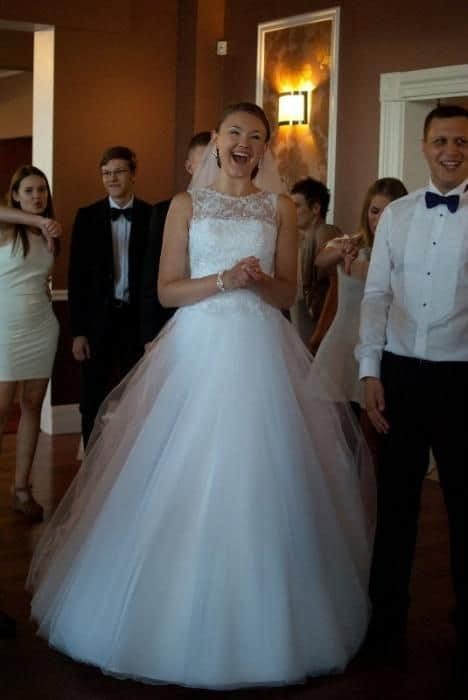 Suknia jest w kolorze białym, doskonale pasuje do każdej karnacji. Dół uszyty jest z tiulu, spódnica z 4 warstw tiuli, satyny i podszewki. Gorset pięknie zdobiony koronką. Z tyłu wiązana więc doskonale dopasowuje się do sylwetki. W środku znajduje się szeroka guma zapinana na haftki dzięki której suknia lepiej się dopasowuje do figury. Najwyższej jakości materiały. Suknia mimo swojej objętości jest bardzo lekka. Bardzo wygodnie się w niej chodzi, nie krępuje ruchów, pięknie układa się w tańcu. Była użyta tylko raz na ceremonii, przyjęciu oraz na sesji. Do sukni jest również piękny gładki welon. Suknia na wzrost 183 + obcas 4,5 cm więc jest możliwość skrócenia bez utraty fasonu. Rozmiar - jest regulacja.