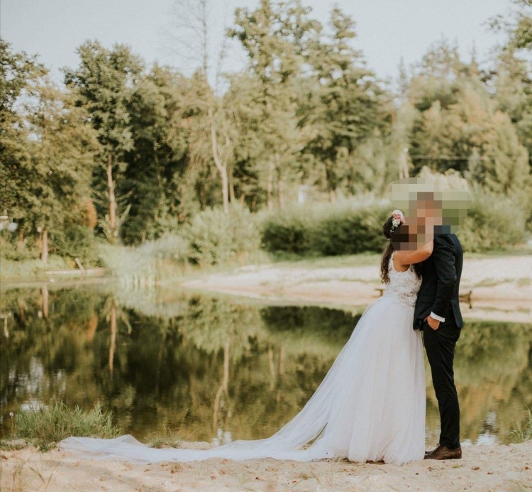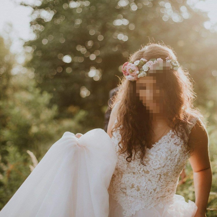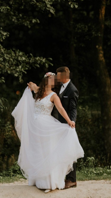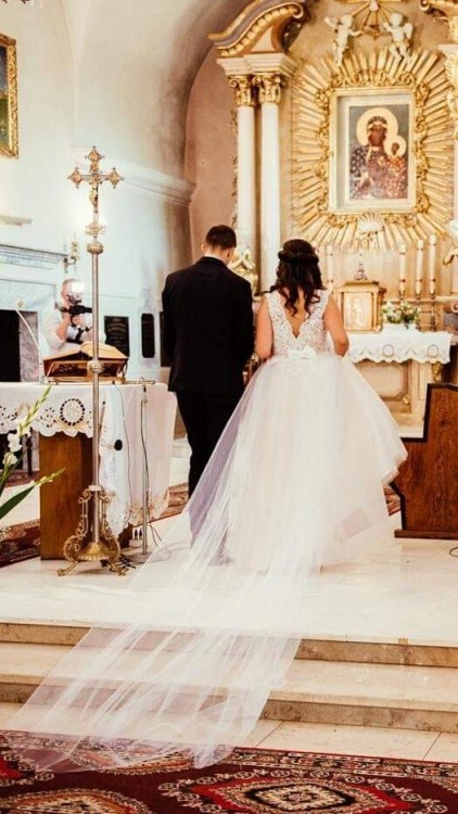 Sprzedam suknię ślubną rozmiar 38/40, szyta na wzrost 170+obcas. Góra - biała koronka na cielistym tle, z delikatnymi koralikami. Dół tiulowy (jedna warstwa tiulu jest w kolorze ecru). Suknia bardzo wygodna, nie krępuje ruchów. Dodaję odpinany tren.