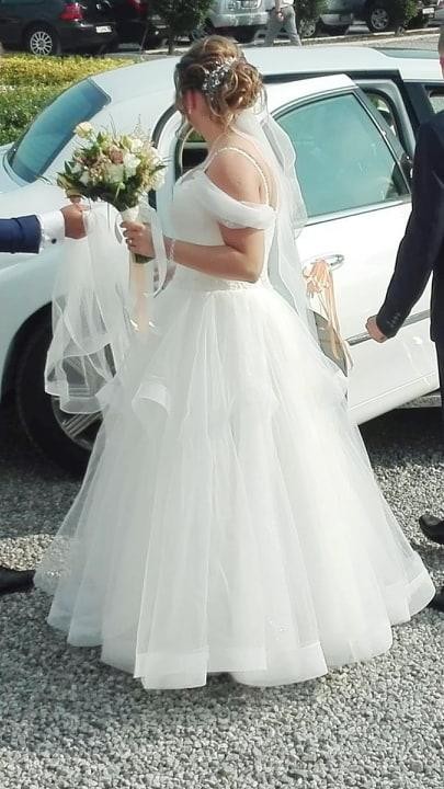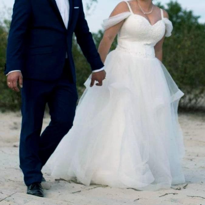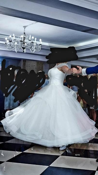 Sprzedam suknię ślubna gorsetową kupioną w salonie ślubnym Diana. Rozmiar sukienki 40/42 dzięki gorsetowi dopasuje się do osoby noszącej rozmiar 38 jak i 44 szyta na osobę o wzroście 160cm i 8cm obcas. Suknia jest w idealnym stanie już po praniu. Posiada pod falbanką brokatowy tiul wiec pięknie się błyszczy podczas tańca. Kolor sukni jasny śmietankowy. Gorset ręcznie zdobiony kryształkami. Cała suknia szyta według mojego projektu. Więcej informacji podam pod nr tele. 665-529-715