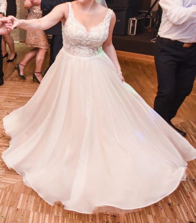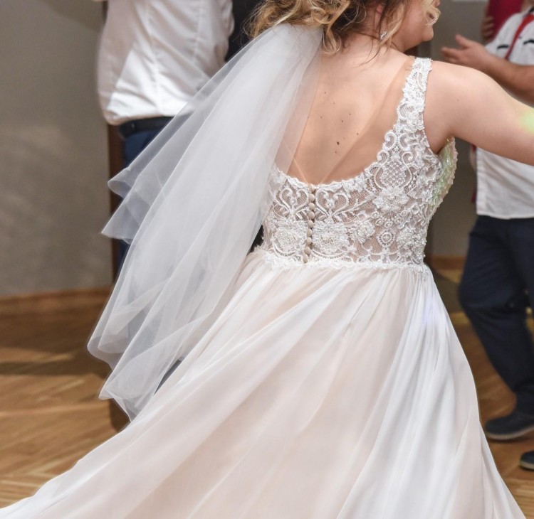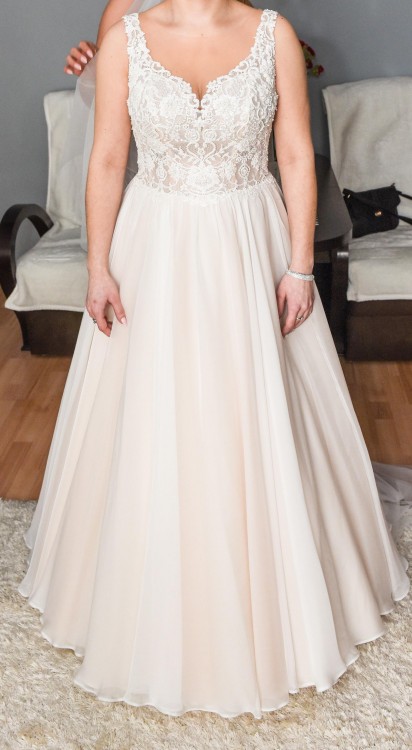 Sprzedam wyjątkową suknie ślubną stylu księżniczki. Zakupiona w salonie sukien ślubnych Ketrin w Lublinie w lutym 2019. Suknia jest w stanie idealnym, jak nowa. Góra z koronki francuskiej ręcznie zdobionej, bardzo wygodna i przyjemna. Dół jedwabny w kolorach różu, brązu (takie ombre). Szyta na miare 155cm+8cm obcas. Do sukni dodaję halkę,koło,dwa gładkie welony bez żadnych zdobień krotki- 70cm i długi -250cm. Suknia jest śliczna wyróżnia się od innych.