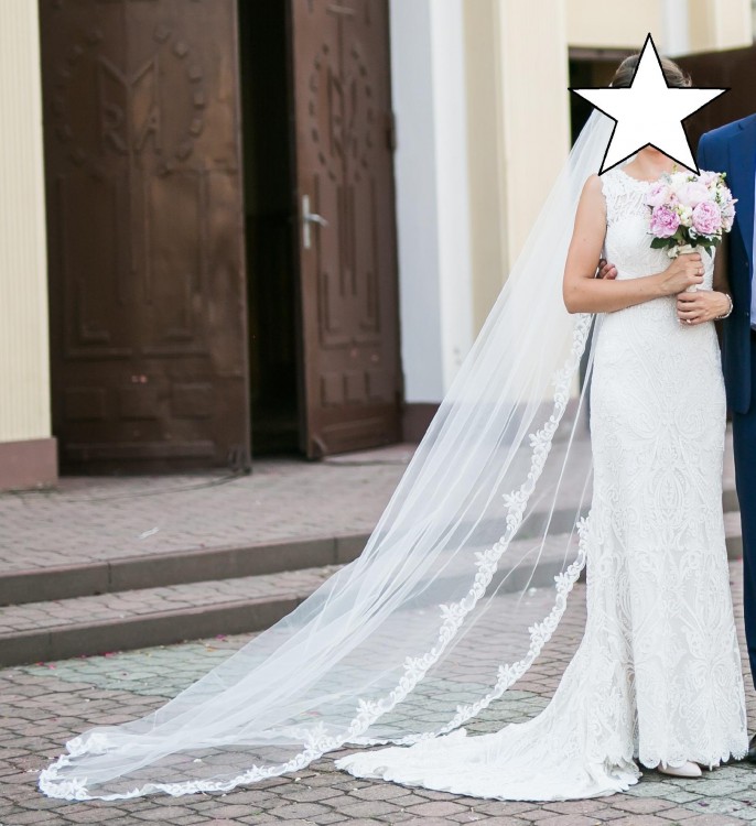 Mam na sprzedaż suknię z dobrej jakości koronki, wyszywaną koralikami i cekinami, tren podpinany. Sukienka pięknie się układa pomimo obcisłego kroju syrenki, podkreśla kobiece kształty, bardzo wygodna. Założona 2 razy, podczas ślubu i sesji zdjęciowej. Szyta na wzrost 164 + obcas 8 cm, rozmiar 34, po praniu. (Cena sukni w salonie 6.000 zł). Szczegółowe wymiary mogę podać w wiadomości prywatnej.