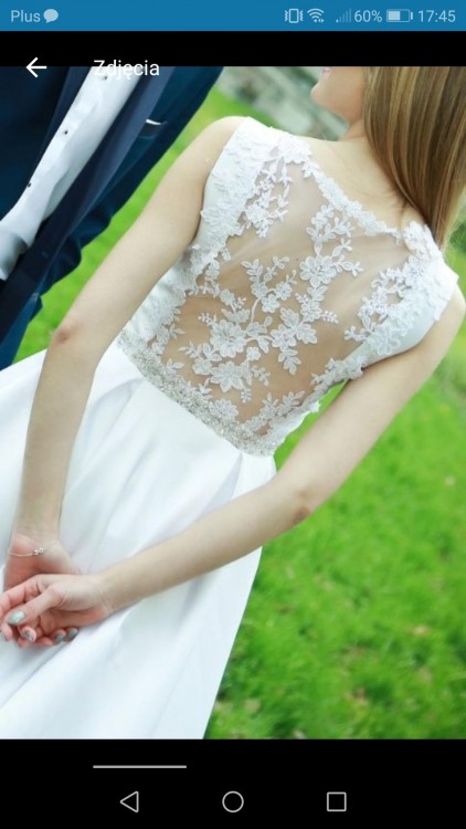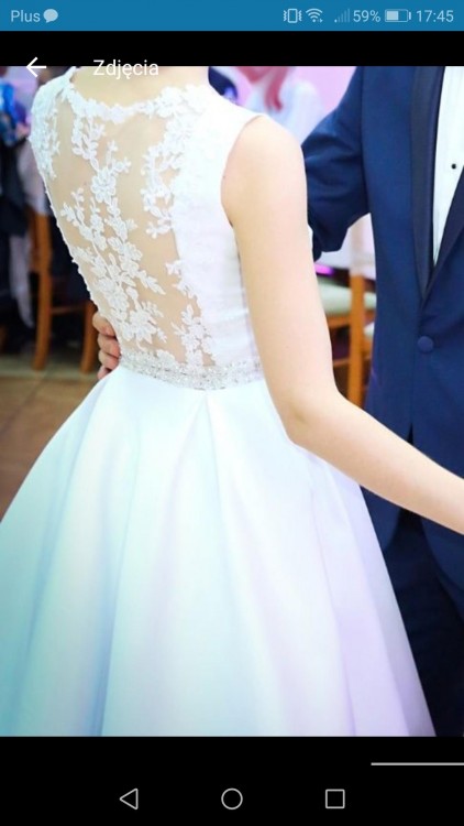 Witam, mam na sprzedaż białą suknie ślubną wykonaną z materiału Mikado. Sukienka ma szerokie ramiączka, odcinana jest w tali pięknym paskiem wykonanym z cyrkonii i perełek. Dół sukni uszyty w kontrafałdy, dlatego też ładnie się układa i obroty w tańcu wyglądają efektownie. Plecy sukienki są przezroczyste, pokryte koronkową aplikacją. Sukienka jest rozmiaru 34 (na „mniejsze” 36 też powinna pasować). Szyta na wysokość 167cm + 10cm obcas.