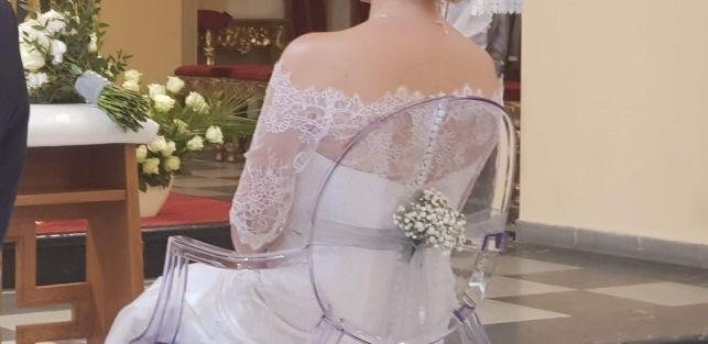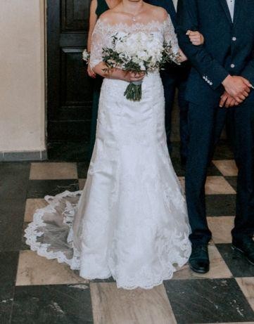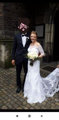 Sprzedam piękną suknię ślubną kupioną w maju 2018 w salonie sukien ślubnych Anna w Katowicach . Suknia została zakupiona w rozmiarze 10 , lecz przed samym ślubem została zwężona i skrócona więc osoby zainteresowane zapraszam do przymiarek . Mój wzrost to 156 cm + 10 cm obcas . Suknia efektowna, posiada piękny koronkowy tren , który na sali można bez problemu podpiąć . Do sukni dołączam bolerko warte 400 zł.