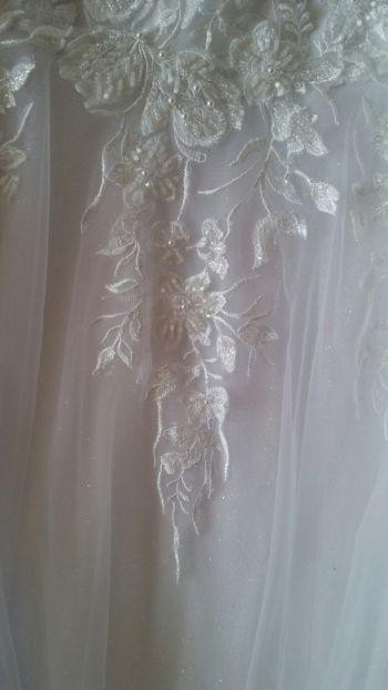 Dół lekko mieniący, tiul na podkładzie brokatowym, co dodaje sukni uroku.