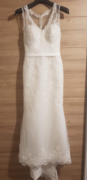Suknia z lekkim trenem. Ma wszyty guziczek do podwiązania w czasie tańca. Posiada poduszki na piersi (można wypruć). Możliwość przymiarki.