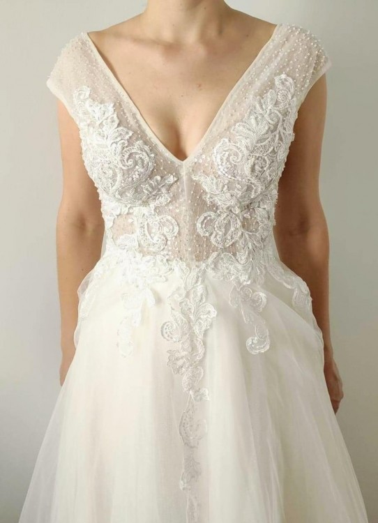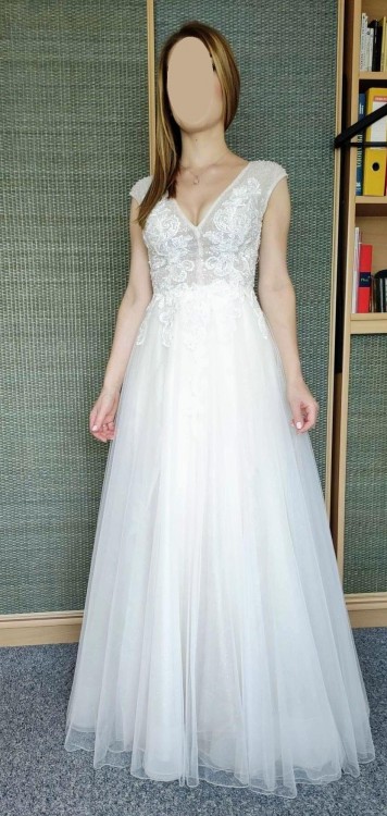 Suknia jest w kolorze ecru/złamana biel, dół delikatnie się mieni. Fason bardzo ładnie podkreśla talię i biust, dół jest bez koła, dzięki czemu suknia jest lekka, wygodna i pięknie układa się podczas tańca.