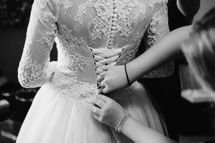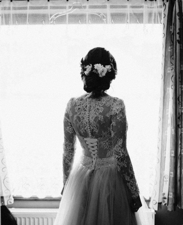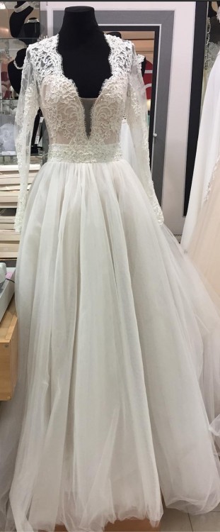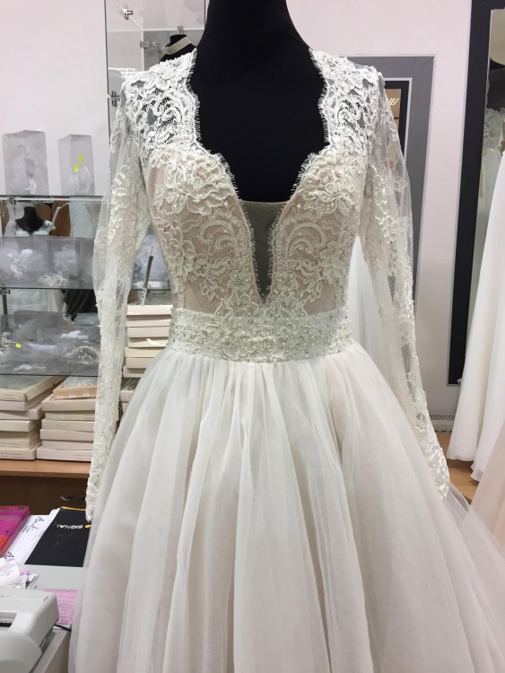 Suknia ślubna typu "księżniczka", rozmiar 38, długi rękaw z delikatnej koronki, która pokrywa całą górę. Suknia ma wbudowany gorset, wiązanie widoczne jest z tyłu. Od szyi do gorsetu biegną małe guziczki. Na przodzie sukienki dekolt typu "V".