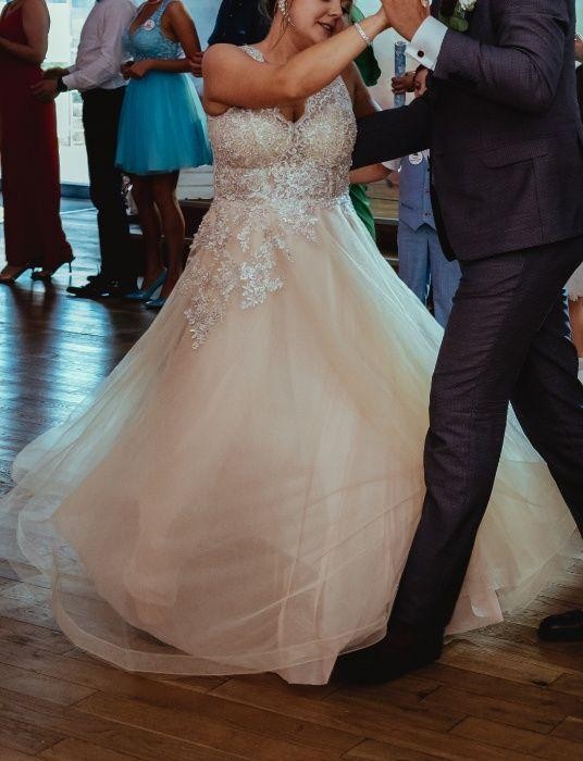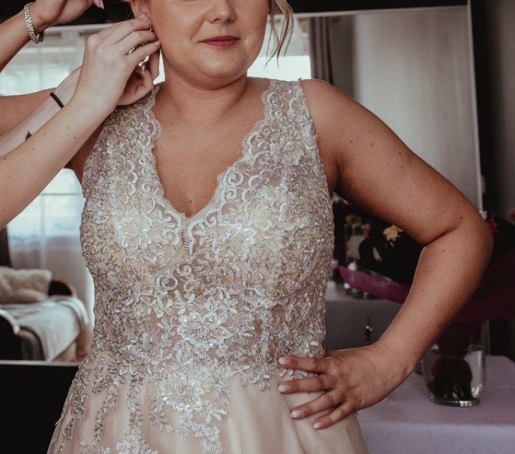 Dół sukni składa się z dwóch warstw materiału w kolorze ecru, kolejne trzy warstwy to tiul w kolorze szampańskim. Zewnętrzna warstwa tiulu podszyta jest taśmą. Mimo kilku warstw materiału i tiulu, suknia nie jest ciężka, a bardzo zwiewna, świetnie układała i prezentowała się w tańcu.
