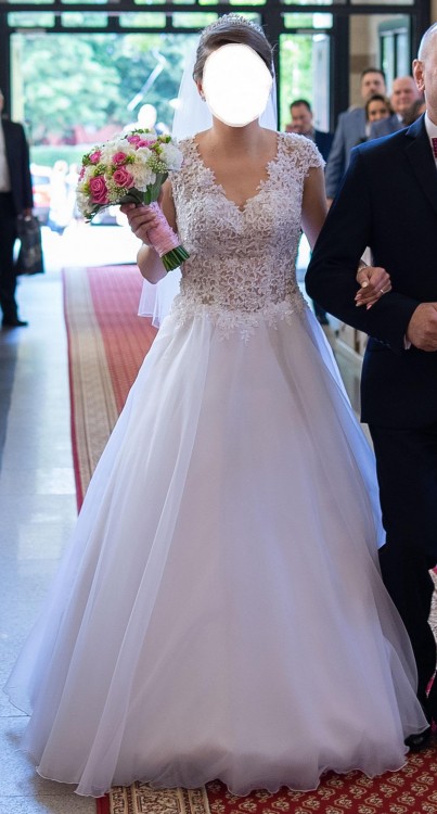 Mam do sprzedania białą suknie ślubną sierpień 2019, w bardzo dobrym stanie, szytą według własnego projektu. Rozmiar około 38, wzrost 168 cm + 8 cm obcas. (Możliwość skrócenia). Góra sukni wykonana jest z koronki zdrobionej kamieniami i koralikami układanej i naszywanej ręcznie. Dół uszyty kilku warstw na podszewce przepięknie przebijającym brakatem. Dzięki usztywniającemu kołu jest bardzo wygodnie i ładnie się prezentuje. Pralnia do uzgodnienia.