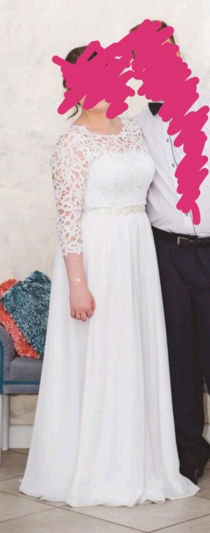 Mam do sprzedania używana suknie ślubną - tylko raz noszoną:) sukienka jest skromna, prosta i bardzo wygodna. Kupiona w salonie. Cena z salonu 2800. Długość sukienki na 170 plus obcas 6 cm. Na zdjęciu mam płaskie buty. Rozmiar sukienki 42/44. Cena do negocjacji