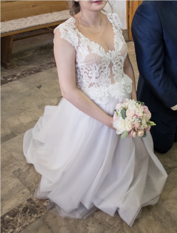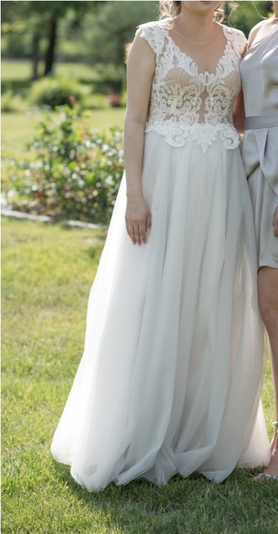 Mam do sprzedania suknię ślubną uszytą tego roku w maju. Sukienka nie jest czysto biała, lecz dół ma odcień szarawy tzw. "gołębi", który staje się coraz modniejszy. Suknia dopasowana do rozmiaru 36, spokojnie będzie pasowała również na 38, oraz do wzrostu 168 i obcasów ok. 9cm.. Do ślubu szłam z brzuszkiem w 5,5 miesiącu ciąży (i zmieścilam ją bez problemu 3 tygodnie poźniej), także polecam też Paniom w ciąży :)
