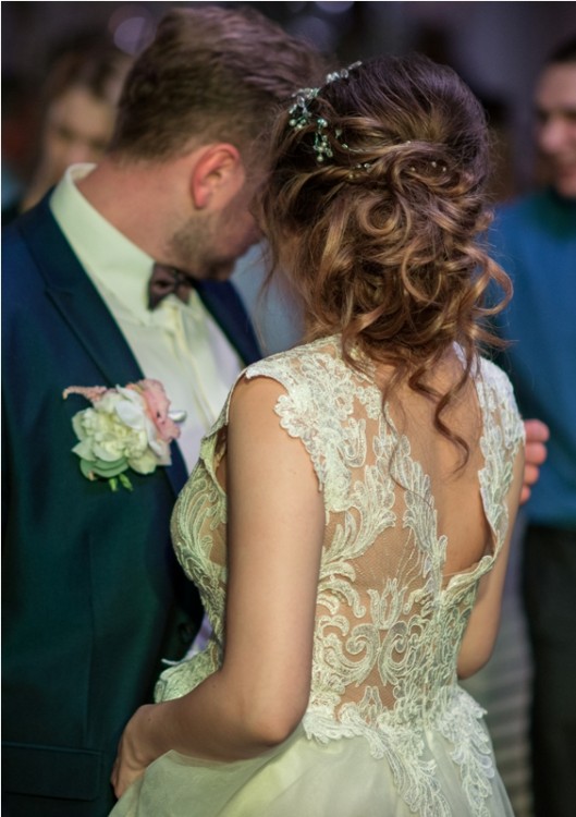 Sukienka szyta na miarę. Dół sukni jest w kolorze "gołębim".