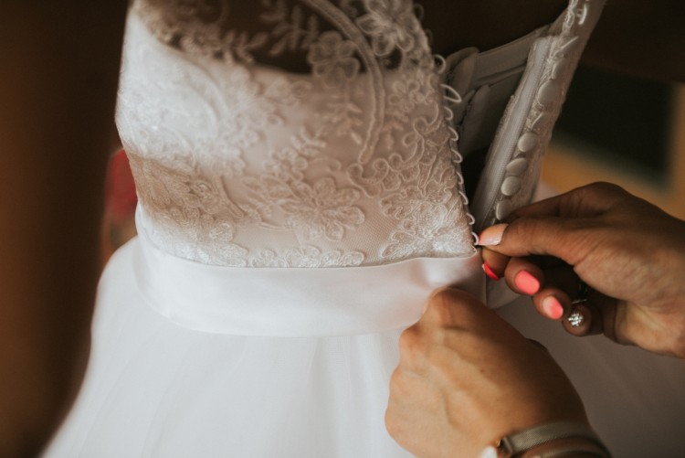 Gorset sukni zasuwany na zamek i zapinany na guziki, dodatkowo posiada klamry na biustonosz.