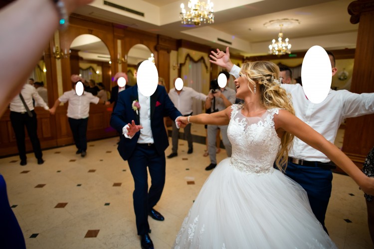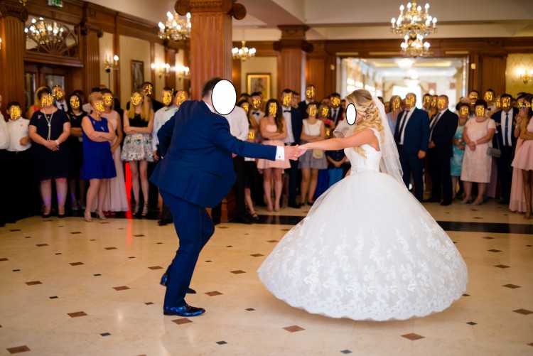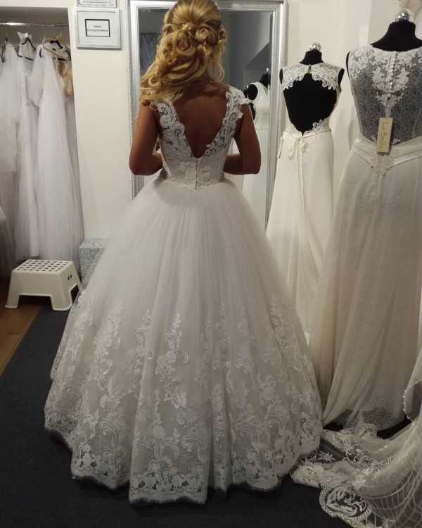 Suknia ślubna typu ,,Princessa", zdobiona koronką i błyszczącymi aplikacjami.