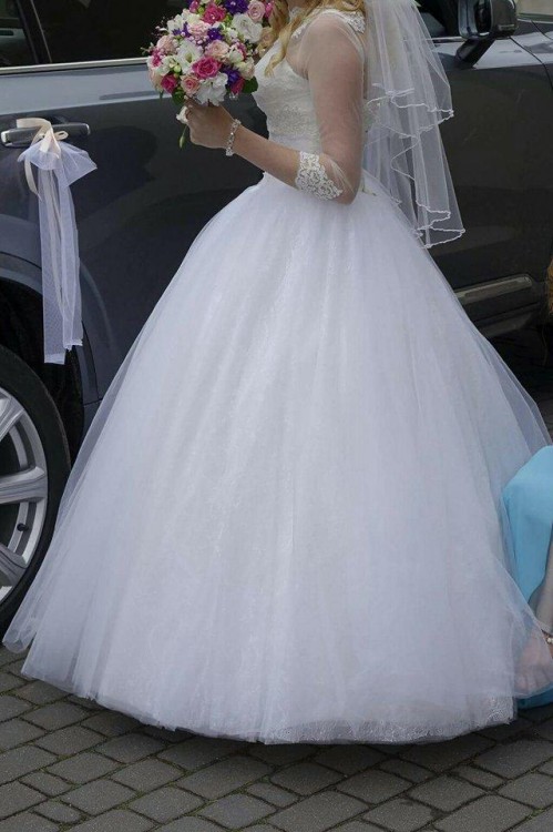 Suknia była szyta na wzrost 170 cm. Dodatkowo w komplecie bolerko ślubne zapinane z tyłu, chowające dekolt i ramiona na czas ceremonii w kościele, także obszyte koronką.