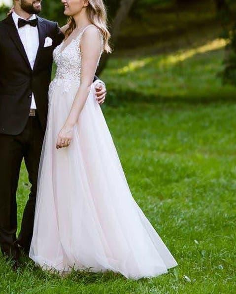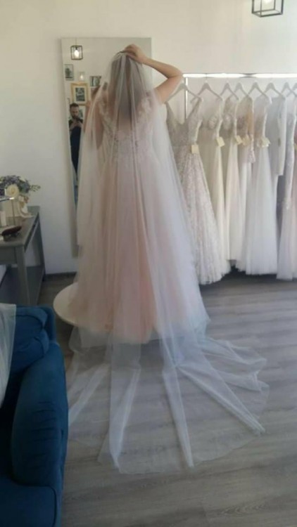 Dodatkowo z suknią sprzedaję 2 welony. Krótki do pasa i długi załączony na zdjęciu.