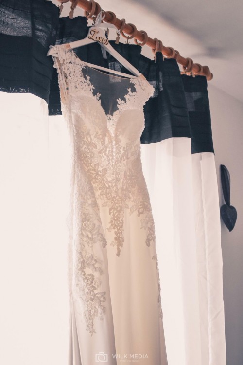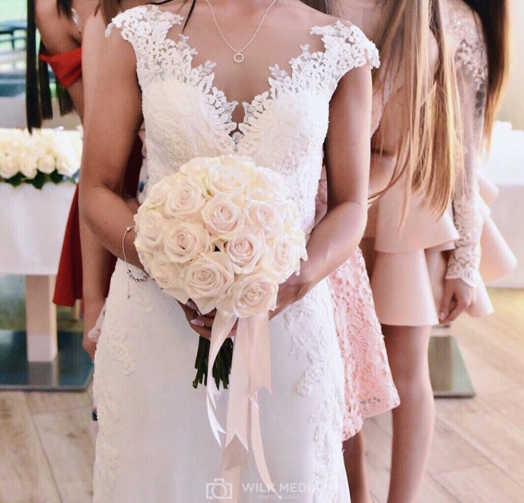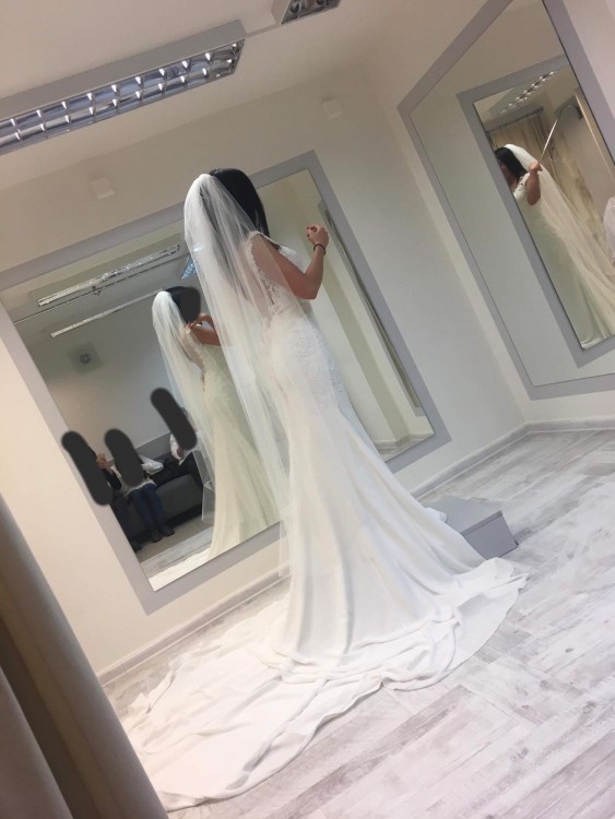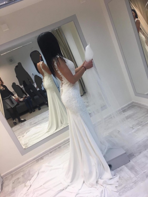 Piekna suknia slubna w stylu syrenki z odkrytymi plecami i wycietym przodem natomiast przod posiada siatke ktora jest niewidoczna . Rozmiar 32-34 z trenem ktory sie podczepia , bardzo wygodna gdyz Od Kolan w dol Nie jest waska tylko material delikatnie sie poszerza. Zakupiona w salonie flossmann Wroclaw .