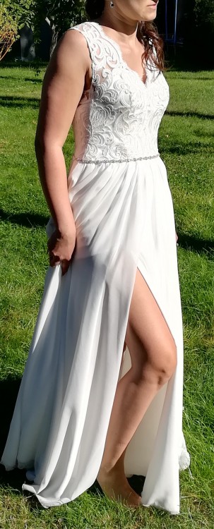 Oferuję suknie ślubną 2w1,tzn. spódnica z trenem jest odpinana na napki, nie posiada rozporka ma nogę. Z kolei w pierwotnej sukni jest rozporek na nogę, spódnica bardzo ładnie się układa i suknia jest wygodna. Model sukni ermana, jednak po przeróbkach, szyta na miarę, jakoże byłam miesiąc po porodzie suknia ładnie ukryje nieduży brzuszek ciążowy, moje wymiary to 84/75/92, myślę że jest możliwość regulacji w pasie, ja dodatkowo miałam doszyte napki. 172cm plus 5cm obcas. Polecam. Prosze o kontakt mailowy anecia35@interia.pl.