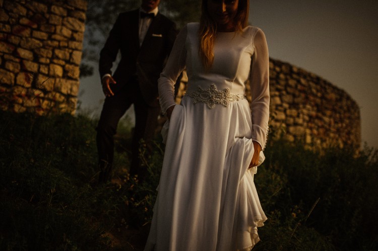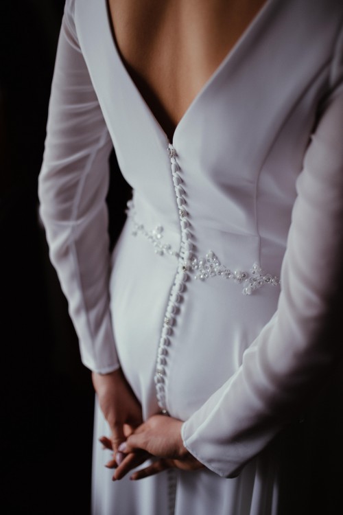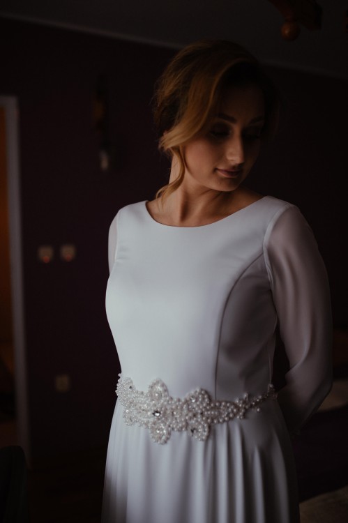 Suknia z muślinu szyta na miarę w salonie krawieckim na rozmiar 98-80-98. Bardzo lekka. Pas ręcznie wyszywany na sukience. Ozdobne guziczki z tyłu na całej długości sukienki oraz na rękawach. Suknia prosta, bez trenu.