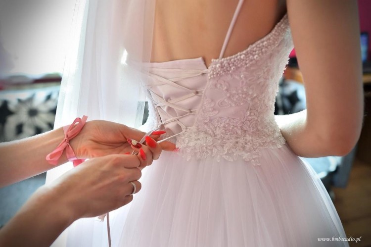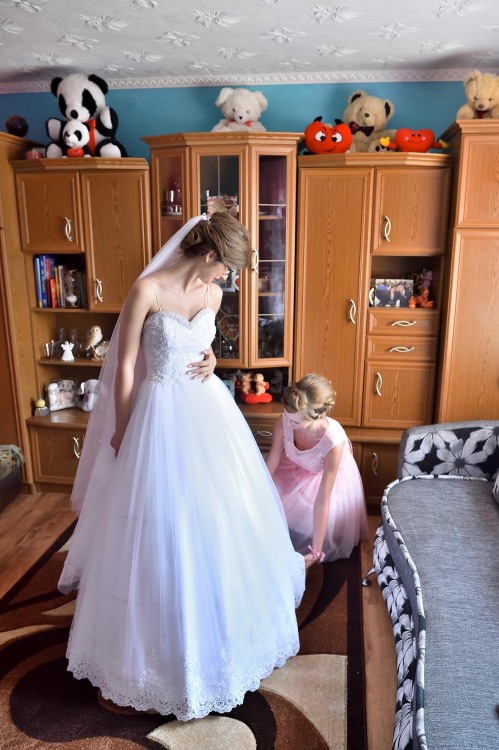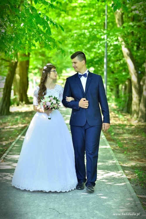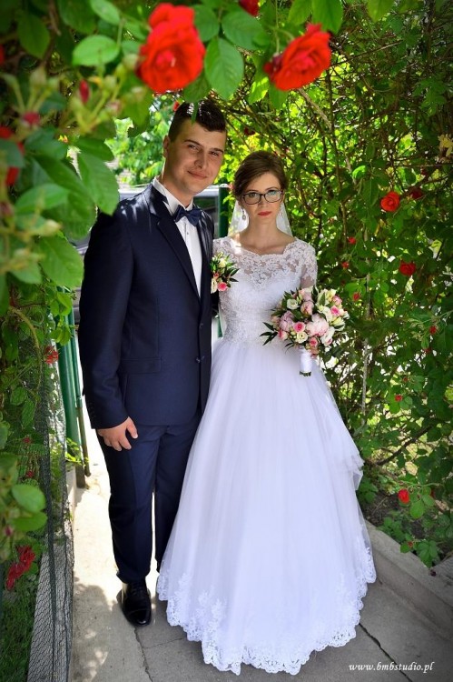Suknia ślubna rozmiar 32/34 lub małe 36. Kolor biały. Suknia na wzrost 164 cm + 10 cm obcas. Do sukni dołączam koło, welon długi prosty oraz bolerko. Góra sukni koronkowa z delikatnymi koralikami, regulowana gorsetem. Bolerko zapinane na guziczki. Suknia do prania chemicznego. Więcej informacji udzielę przez telefon.