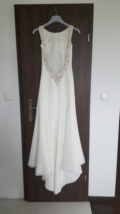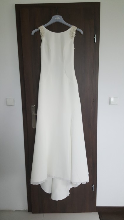 Oferuję do sprzedaży oryginalną suknię ślubną marki Vanilla Sposa. Suknia w rozmiarze 34/36 na wzrost 160cm. W biuście wszyte miseczki. Średniej długości tren, podpinany od wewnętrznej strony sukni. Głęboko wykrojony dekolt na plecach obszyty jest koronką z cyrkoniami i kamieniami, nadając sukni wyjątkowej elegancji.