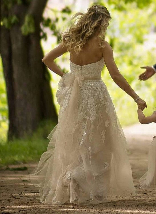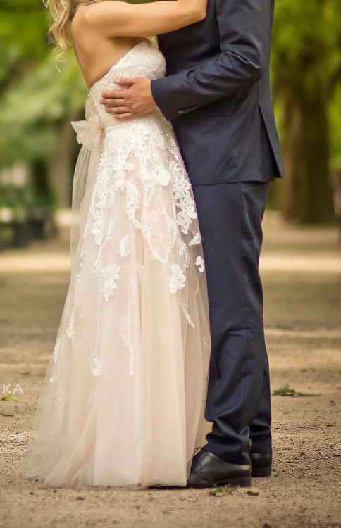 Suknia zwezana na rozmiar 36, wzrost ok 163 plus 8 cm obcas. Wyszywana mieniacymi koralikami. Wszyte miseczki push up. Kolor ivory i piaskowy. Bardzo lekka i wygodna. Gorset nie przesuwa sie. Polecam.