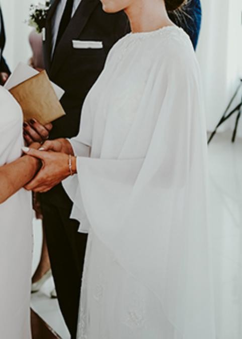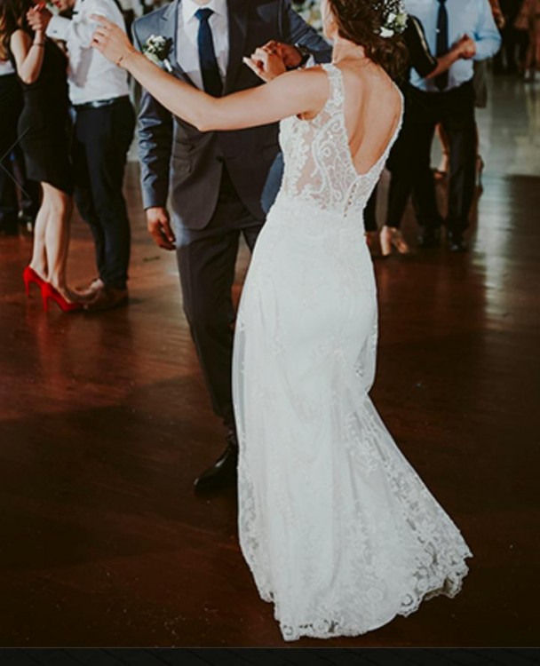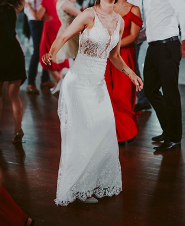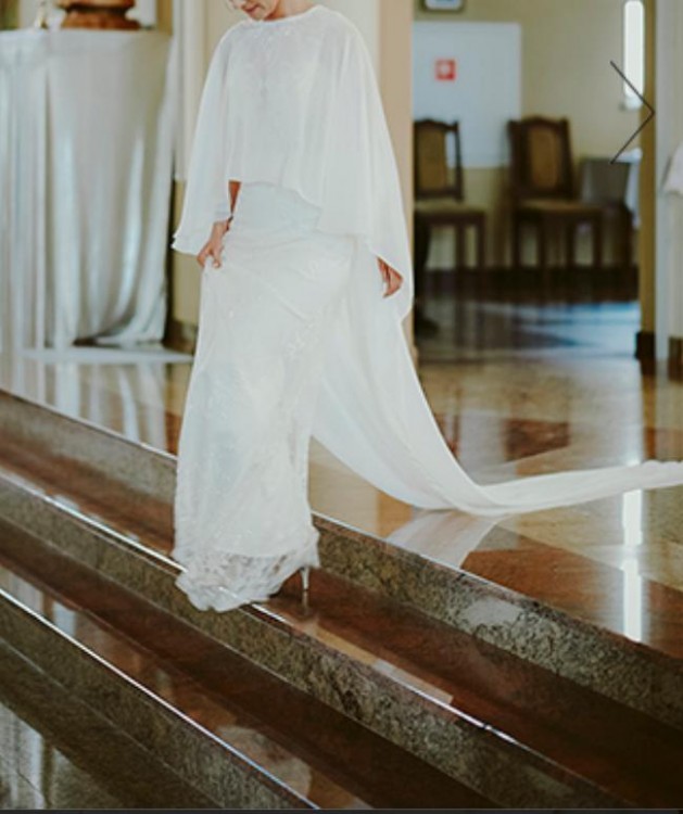 Sprzedam suknię ślubną z kolekcji 2019. Suknia szyta na miarę, na wzrost 167 + 9 cm szpilki. Suknia jest koloru ecru, góra koronkowa, na cielistym tiulu, wszyte miseczki. Dół składa się z przylegającego do ciała, gładkiego materiału, na kształt ryby, natomiast na wierzchu puszczona jest delikatna koronkowa warstwa z mieniącymi się koralikami. Suknia zakończona jest krótkim trenem, około 5 cm, który nie przeszkadza w chodzeniu oraz tańczeniu, jednak można go też podpiąć do góry. Do sukni dołączona jest także jedwabna narzutka, z przodu sięgająca do talii, natomiast z tyłu z trenem na około 2 metry. Narzutka idealnie nadaje się do kościoła, gdyż sama suknia jest dość odważna ;) Suknia jest leciutka, bardzo wygodna i elastyczna. Rozmiar to 34/36. W celu uzyskania szczegółowych informacji, wymiarów, zdjęć zapraszam do kontaktu :)