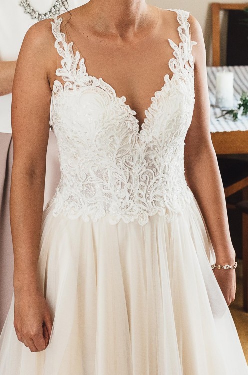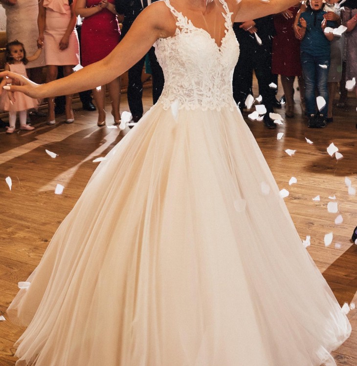 Sprzedam moją wyjątkową suknię ślubna w kolorze ecru. Szyta na osobę noszacą rozmiar 34/36 o wzroscie 163cm + buty 8cm. Gorset typu naked - naszyte piękne aplikacje. Wszyte miseczki. Suknia posiada jedną warstwę beżowego tiulu co daje efekt szampańskiego dołu. Suknia jest wygodna i pięknie układa się w tańcu. Ubrana raz na mój wielki dzień. Zapraszam do przymiarki :)