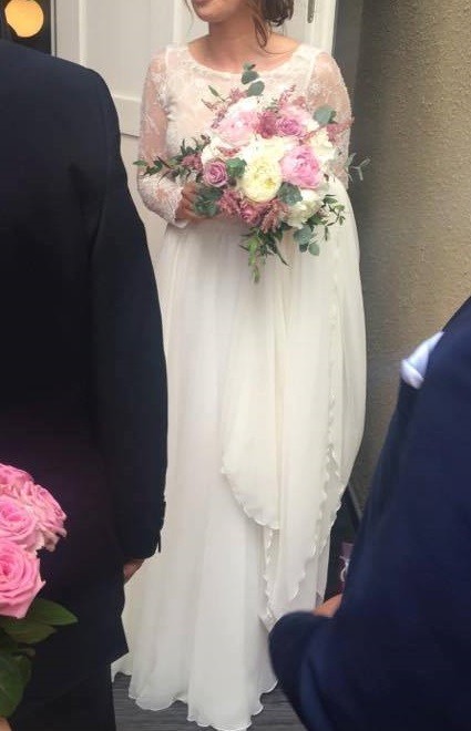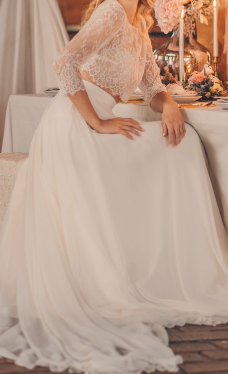mam na sprzedaż sukienkę ślubną w stanie idealnym - jak nowa, żadnych mankamentów. Szyta na wzrost 169 cm + 8 cm obcas (dłuższa, zasłaniająca buty). Rozmiar 34/36/38. Sukienka jest lekka, zwiewna, subtelna i romantyczna. Wykonana z wysokiej jakości materiałów - ręcznie zagęszczana koronka i muślin, utrzymana w stylistyce romantycznej, rustykalnej, boho i ellegance. Bardzo delikatna, zwiewna i wygodna. Otrzymała wiele komplementów. Sukienka dwuczęściowa: body koronkowe + muślinowa spódnica.