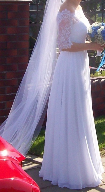 Sprzedam piękną suknię ślubną, zakupioną w salonie ANNA w Gliwicach - biała, zwiewna, muślinowa + koronkowe bolerko i długi welon