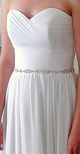 Pod gorsetem wszyty jest piękny biżuteryjny paseczek, który to właśnie nadaje tej skromnej sukni niezwykły urok.