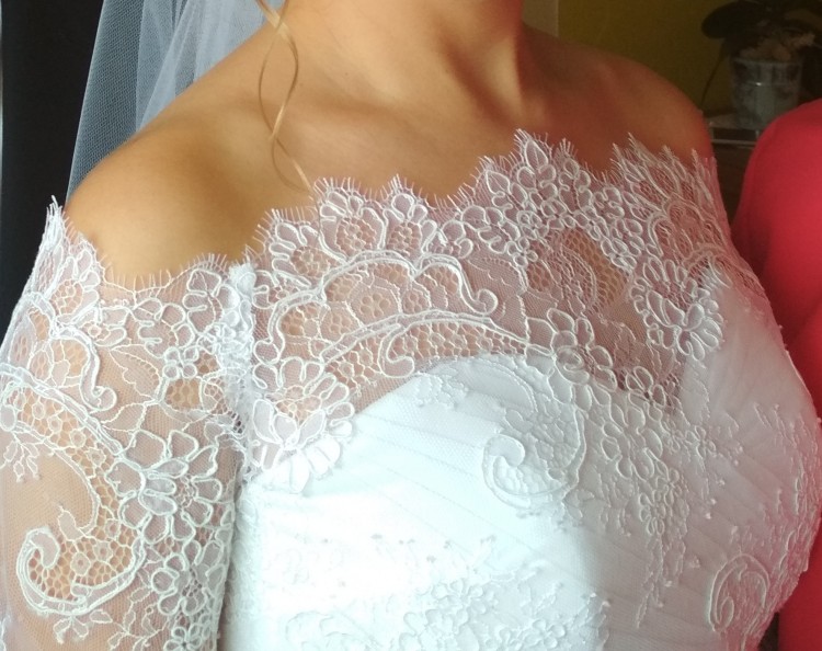 Do sukni dodaję śliczne koronkowe bolerko, zapinane na guziczki, dzięki któremu suknia prezentuje się jeszcze lepiej, natomiast po jego zdjęciu otrzymujemy zupełnie nową suknię!