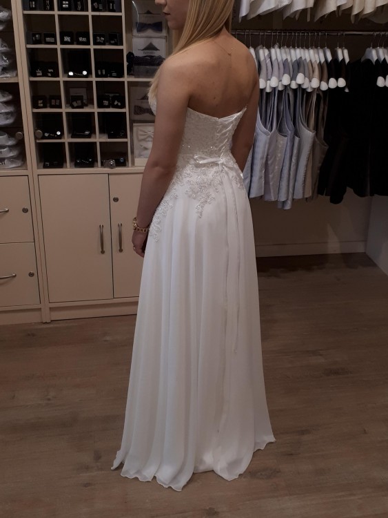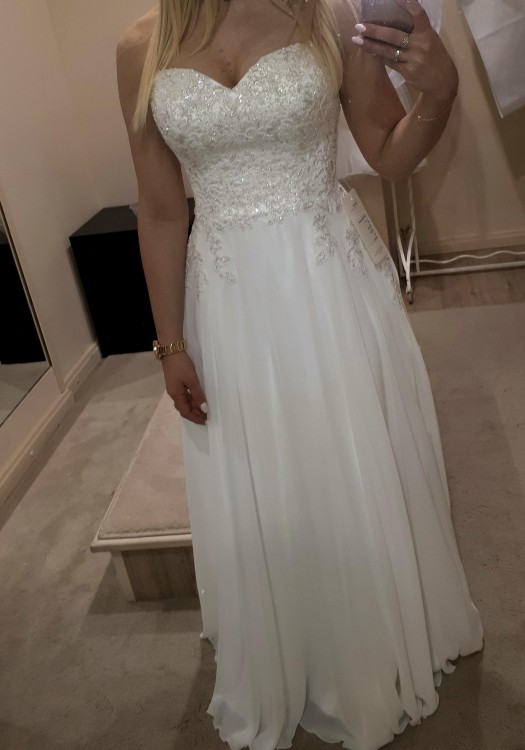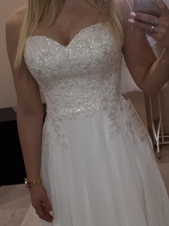 Sprzedam suknię ślubną kolor śmietanka ubrana 2 razy, na ślub i sesje zdjeciową, profesjonalnie wyczyszczona. Suknia szyta na miare będzie pasować na drobną niższą osobe rozmiar 34-36 szyta na wzrost 160cm + 6cm obcas. Piękna, zwiewna, delikatna, super wygodna przetańczyłam w niej całą noc, suknia dla osoby która ceni sobie wygode, gorset jest właściwie nie wyczuwalny idealnie podkreśla i dopasowuje się do sylwetki. Dodam, że nie było na weselu osoby która nie zachwycałaby się tą suknią.
