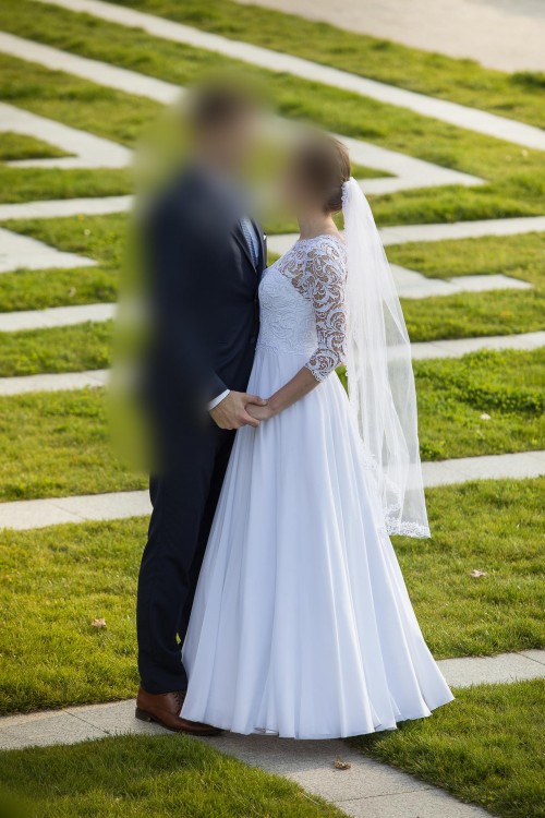 Sprzedam suknie uszytą w salonie Margarett.Góra z gipiury, dół muślinowy.Z tyłu zapinana na perełki i zamek.Wszyty biustonosz. Kolor śmietankowy.W zestawie małe koło (zakładane osobno).
