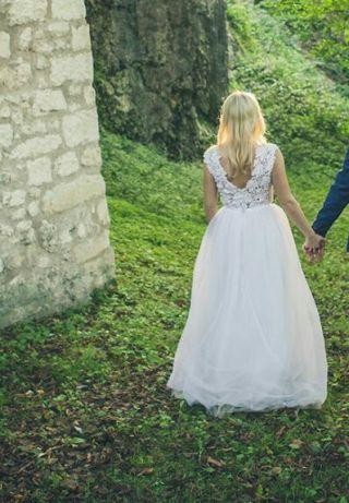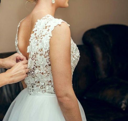 Gratis dokładam krótki welon. Góra uszyta z gipiury, dół to 3 warstwy tiulu. Cena 900 zł, tiul jest lekko potargany na dole sukni. Można skrócić albo wymienić.