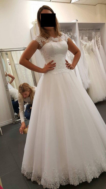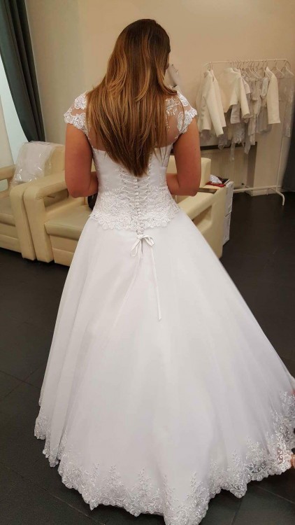 Suknia jest wiązana, natomiast koronka na gorsecie zapinana jest na guziczki. Dzięki wiązanemu gorsetowi istnieje możliwość dopasowania do sylwetki. Suknia jest bardzo wygodna i ze względu na koronkę u dołu pięknie układa się w tańcu. Naszyte koronki pięknie mienią się w słońcu.Ubrana dwa razy, w dniu ślubu oraz sesji zdjęciowej. Wyprana w profesjonalnej pralni.