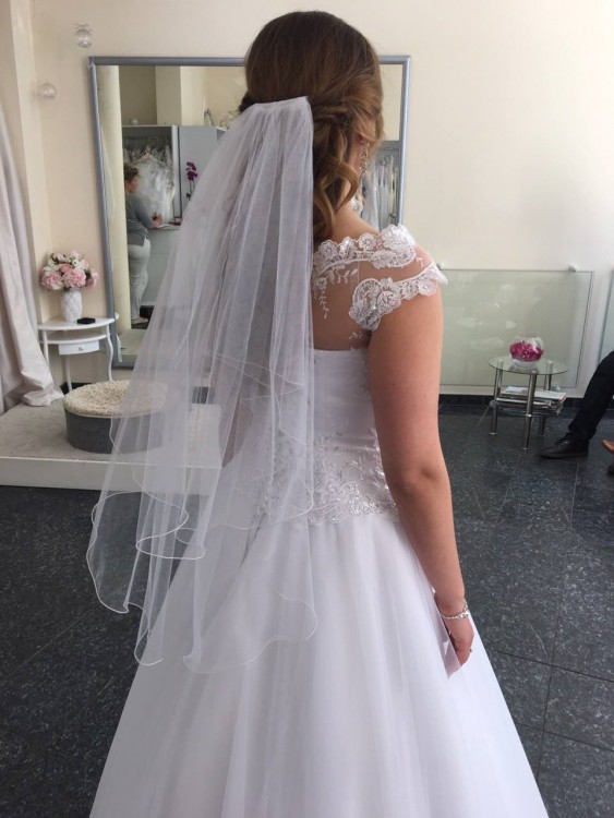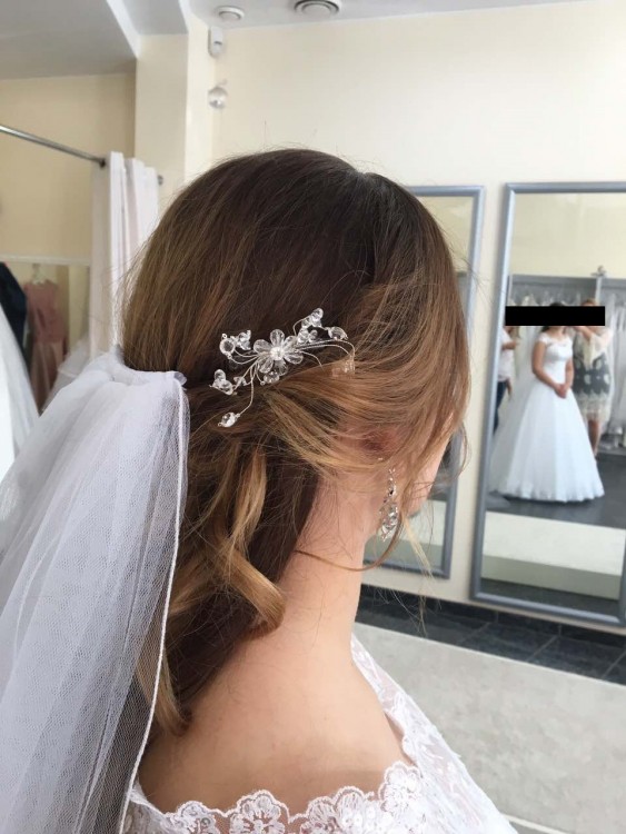 Do sukni dołączam dwa gładkie tiulowe welony, długi oraz krótki sięgający do pasa, a także piękny grzebień do włosów z kryształami Swarovskiego. Nie posiadam koła do sukni.